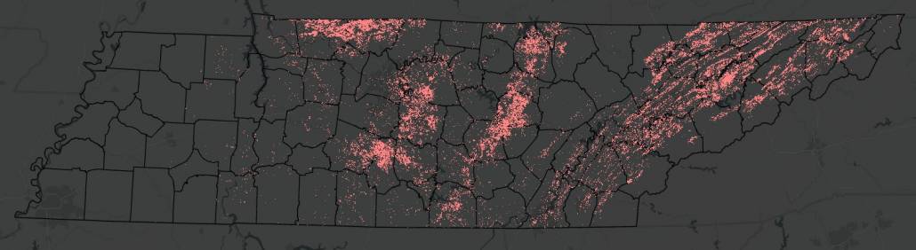The following graphics are created from publicly available GIS data downloaded from various Tennessee websites (particularly, Tennessee Landforms). The illustration shows that the existence of sinkholes outside of the carbonate bedrock is nearly nonexistent and probably caused by other activities than bedrock failure (speculating here, to be clear. This is not a scientific paper so I get to do that).